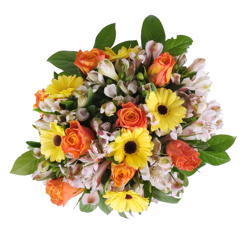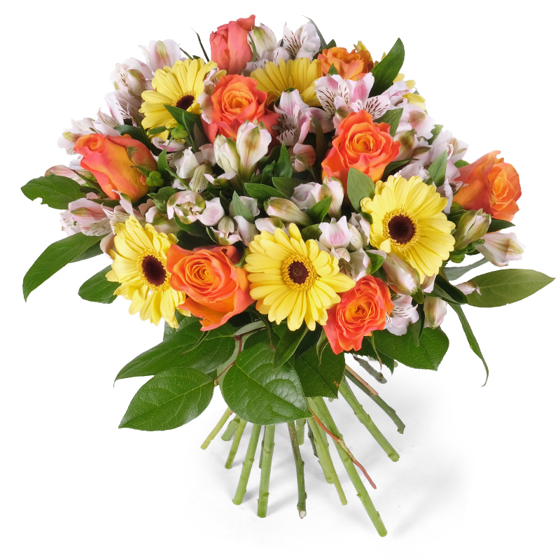 Zawsze świeże kwiaty Trzy gatunki kwiatów - róże, gerbery i alstromerie - uzupełniają się idealnie, tworząc bukiet pełen ekspresji i uroku. Duże, świeże liście nadają kompozycji profesjonalny charakter. Doskonały wybór na ważne okazje, gdy liczy się każdy detal!