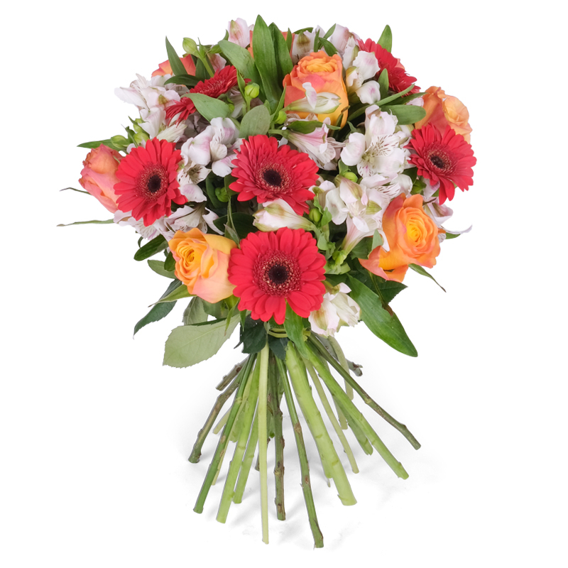 Zawsze świeże kwiaty Damska kompozycja to połączenie trzech pięknych gatunków w jednym bukiecie. Róże wnoszą elegancję i romantyzm, gerbery dodają energii i świeżości, alstromerie subtelnie uzupełniają całość. Prezent trafiający prosto do serca każdej kobiety!