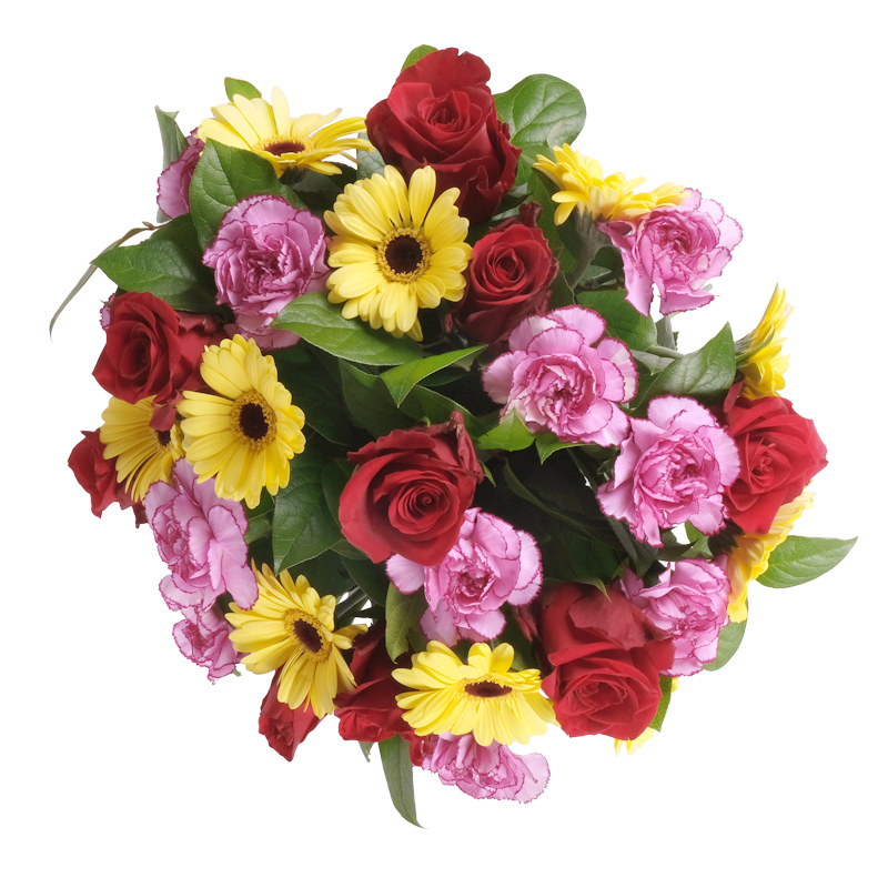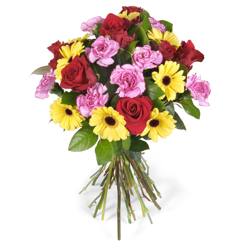 Zawsze świeże kwiaty Ten bukiet to połączenie trzech kwiatowych symboli – miłości, radości i wdzięku. Róże, gerbery i goździki idealnie się uzupełniają. To propozycja pełna pozytywnej energii. Świetny na każdą okazję – od gratulacji po wyznanie uczuć. Piękny gest w eleganckiej formie.